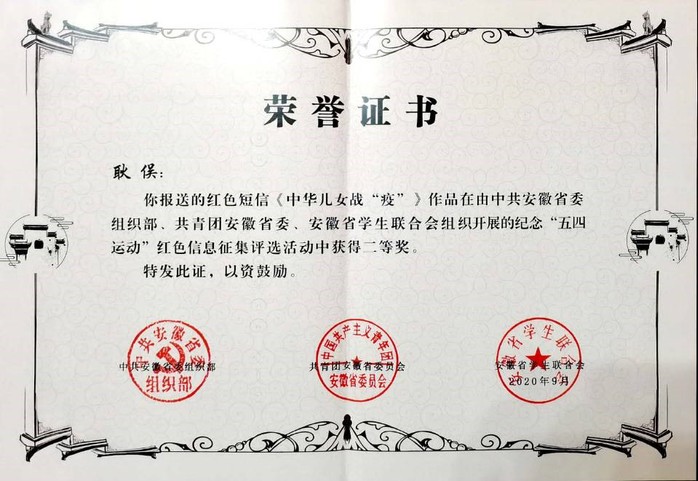 日前,安徽省委組織部、共青團安徽省委、安徽省學生聯合會公布了《安徽省疫情防控和決戰決勝脫貧攻堅紅色信息征集活動獲獎名單》,我校先進制造工程學院學生工作辦公室主任耿俁老師的作品《中華兒女戰“疫”》(詩歌)榮獲二等獎。