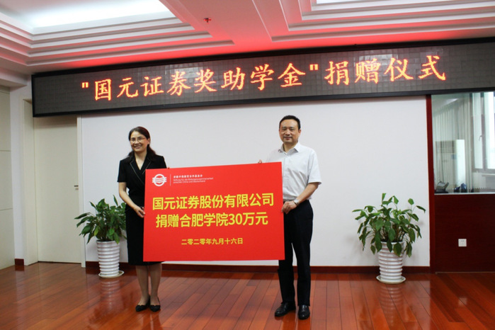 9月16日下午,合肥學院舉行2020年度“國元證券獎助學金”捐贈儀式。國元證券股份有限公司黨委副書記、監事會主席、工會主席蔣希敏一行四人,合肥學院副校長、安徽中德教育合作基金會(以下簡稱基金會)理事長陳秀,校計劃財務處處長、基金會秘書長何世昆,校黨委委員、學生處處長、基金會事業發展部副部長朱濤,校經濟與管理學院院長陳江華等相關部門老師,以及獲得上一年度獎助學金的學生代表參加了捐贈儀式。儀式由基金會管理辦公室主任劉金平主持。