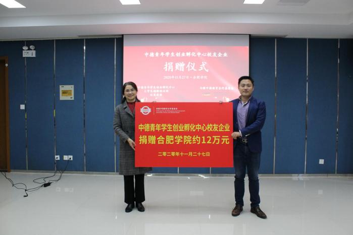 11月27日上午,我校舉行中德青年學(xué)生創(chuàng)業(yè)孵化中心(以下簡稱孵化中心)校友企業(yè)捐贈儀式,合肥學(xué)院副校長、安徽中德教育合作基金會(以下簡稱基金會)理事長陳秀出席。校計劃財務(wù)處處長、基金會秘書長何世昆,校孵化中心主任劉沛平和副主任孫虹,基金會管理辦公室副主任周舟以及孵化中心21家校友企業(yè)代表參加了捐贈儀式。儀式由基金會管理辦公室主任劉金平主持。