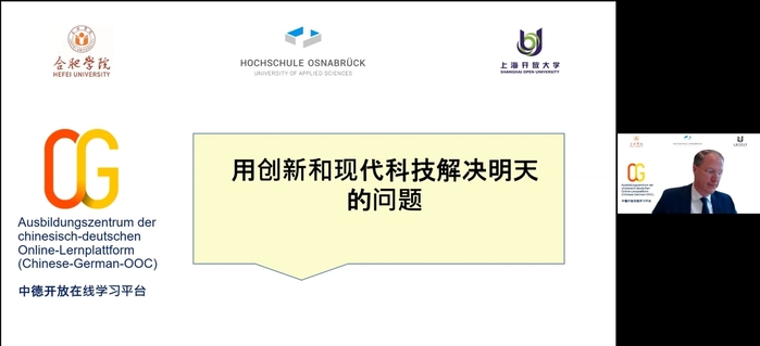 隨后,三校領(lǐng)導(dǎo)簽署了三校合作協(xié)議,分別進(jìn)行了中德開(kāi)放在線學(xué)習(xí)平臺(tái)長(zhǎng)三角基地和德國(guó)基地的揭牌儀式。最后,三方啟動(dòng)雙元制線上線下培訓(xùn),合肥學(xué)院客座教授、奧斯納布呂克應(yīng)用科學(xué)大學(xué)教授拉克勒為勝利油田“工匠班”作題為“用創(chuàng)新和現(xiàn)代科技解決明天的問(wèn)題”的專(zhuān)題報(bào)告。