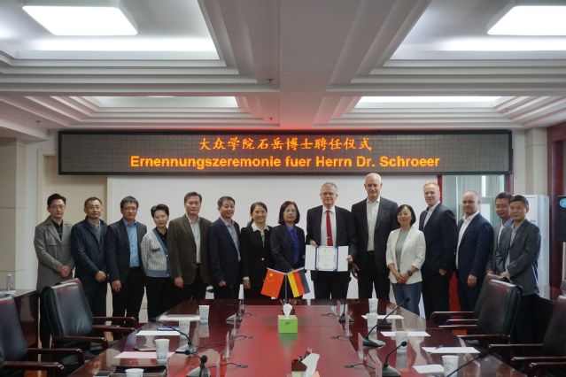 Am Morgen vom 8. Oktober hielt die Hefei-Universit?t die Ernennungszeremonie für Sonderprofessoren ab und stellte Dr. Klaus Schr?er, ehemaligen Vorstand und Ingenieur des Volkswagen Konzerns, als Sonderprofessor im Volkswagen-Institut auf Vollzeitbasis ein. An der Zeremonie nahmen Pr?sidentin Wu Chunmei, Direktor der Abteilung für Organisation Bai Yixiang, Direktor der Abteilung für Studentenangelegenheiten und Dekan des Volkswagen-Instituts Wang Xiaofeng, Direktor der Personalabteilung Ji Ping, Direktor der Abteilung für internationalen Austausch und Zusammenarbeit Zhang Hui, Parteisekret?r des Volkswagen-Instituts Xuan Yuewen, Dekan des Instituts für fortgeschrittene Fertigungstechnik Hu Xueyou und die zust?ndigen Lehrkr?fte teil. Dr. Harry Schneider, Chief Manufacturing Officer von Volkswagen Anhui, Zhu Jiangping, Director of Efficiency Management von Volkswagen Anhui, und Hendrik Dippe, Director of Maintenance Department von Volkswagen Anhui, waren zur Teilnahme an der Zeremonie eingeladen. Die Zeremonie wurde von Vizepr?sidentin Chen Xiu geleitet.