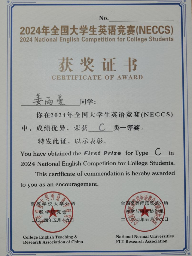 “知之愈明,則行之愈篤;行之愈篤,則知之益明”,不僅要用科學的理論知識武裝自己,更要樹立開拓進取、開放創新的精神,通過實踐把各項工作落到實處,升華所學的各項知識。在大學生活中,姜雨曼秉承“厚德、博學、善思、致用”的校訓,善于抓住能夠展現自我、歷練自我的機會,并從實踐中不斷反饋出知識體系,相輔相成。她積極參加各類學科競賽,并在2024全國大學生英語競賽省賽中取得了省一等獎的優異成績。