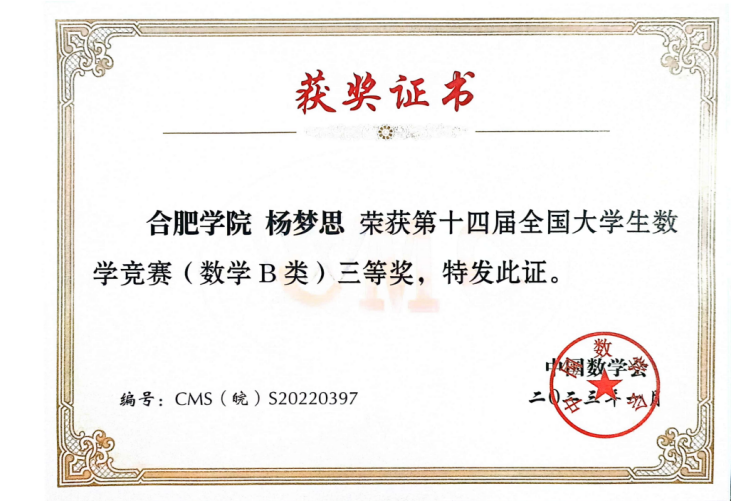“自古圣賢之言學也,咸以躬行實踐為先,識見言論次之。”優異的成績不是終點,而是探索知識廣度與深度的起點,實踐環節更是檢驗知識的熔爐,各類學科競賽便是楊夢思探索的第一步。在數學競賽中鞏固專業知識,了解細分的研究方向,在建模競賽中鍛煉合作意識與解決問題的能力,學會尊重和包容他人的不同意見,在師范生技能競賽中提升授課水平,積累教學經驗。她獲得了第九屆“田家炳杯”全國師范院校師范生教學技能競賽三等獎,安徽省高等學校師范生教學技能競賽三等獎,全國大學生數學建模競賽安徽賽區本科組三等獎2023年安徽省大學生市場調查與分析大賽本科組二等獎,校級獎項數項。在合肥一中實習期間擔任實習老師,全方位配合指導老師,迅速上手各項工作,深入研究教材內容,依據自己的知識體系,針對教學目標的確定、重難點的把握積極出謀劃策,為指導老師提供有價值的參考意見,運用豐富的知識,結合生動有趣的案例,把復雜的知識簡單化,讓學生輕松理解。指導老師對其工作態度和教學能力十分贊賞,展現其良好的專業素養和潛力。