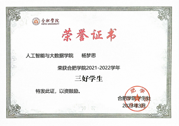 楊夢思,女,漢族,安徽阜陽人,2003年2月生,合肥大學人工智能與大數據學院2021級數學與應用數學(師范)2班學生,中共黨員。現任班級團支書,2023-2024學年體育俱樂部聯盟主席團成員。