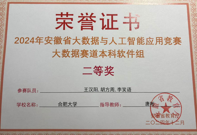 對于王漢陽來說,學習從來都不局限于課堂。他曾經參加過“挑戰杯”、“互聯網+”、大數據與人工智能應用競賽等大大小小的科研競賽,其中多次獲得了理想的成績。在安徽省大學生網絡與分布式系統創新設計大賽中,他與隊友們齊心協力,面對復雜的賽題,他們不畏懼、不退縮。經過連續多日的艱苦奮戰,不斷嘗試各種解決方案,最終成功突破重重難關,榮獲大數據應用賽道三等獎。這次經歷讓他深刻體會到團隊協作的無窮力量,也激發了他在競賽道路上繼續前行的斗志。此后,他又勇敢地踏上了安徽省大數據與人工智能應用競賽的征程。在比賽過程中,他們遭遇了諸多技術難題和時間緊迫的雙重壓力。然而,王漢陽憑借扎實的專業知識和冷靜的頭腦,帶領團隊成員深入分析問題,查閱大量資料,經過反復調試和優化,成功找到了解決方案,在眾多參賽隊伍中脫穎而出,斬獲了大數據賽道二等獎。這些競賽經歷不僅磨礪了他的專業技能,更培養了他堅韌不拔的毅力和創新思維。