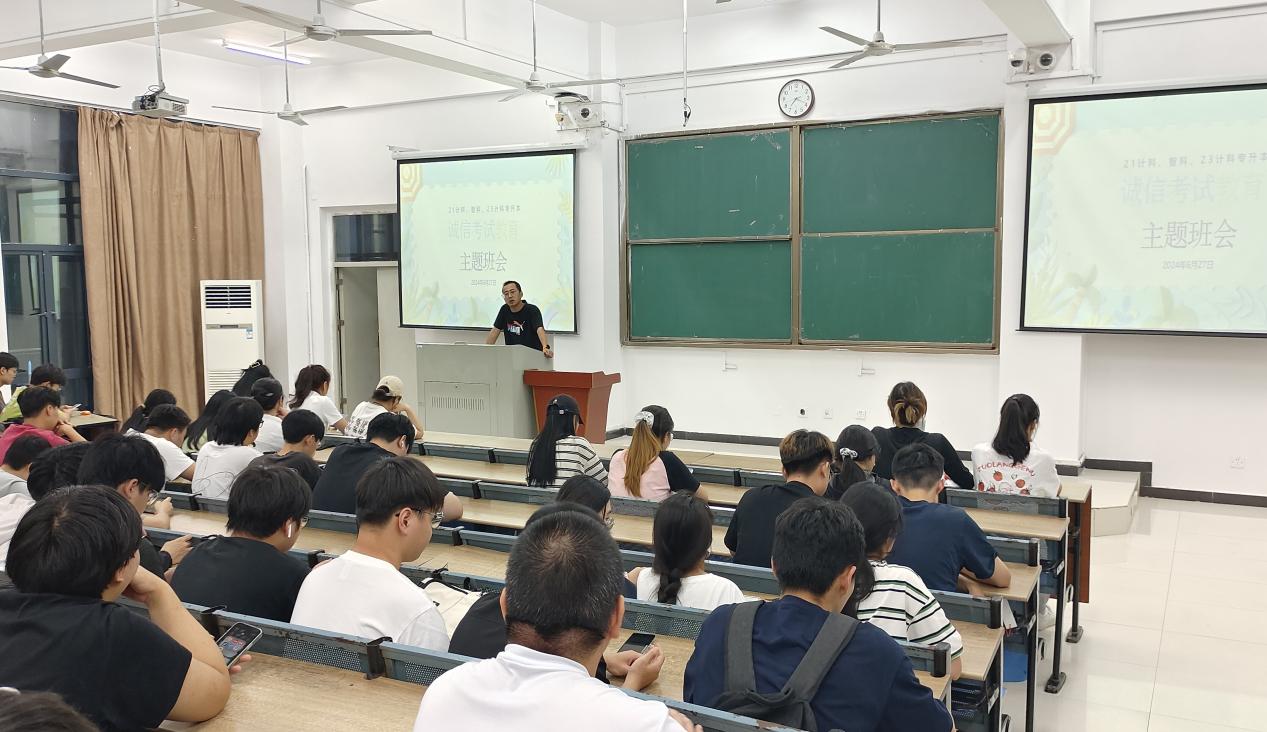 為進一步加強學生誠信意識,提高安全防范能力,并促進學生積極就業,人工智能與大數據學院學生第一黨支部于2024年6月27日晚七點,在36-1JT教室成功召開了以“誠信考試教育”為主題的班會。本次班會特別針對21級計算機科學與技術、智能科學與技術專業以及23級計算機科學與技術專升本班的學生,支部書記、輔導員汪劍老師擔任主講人。