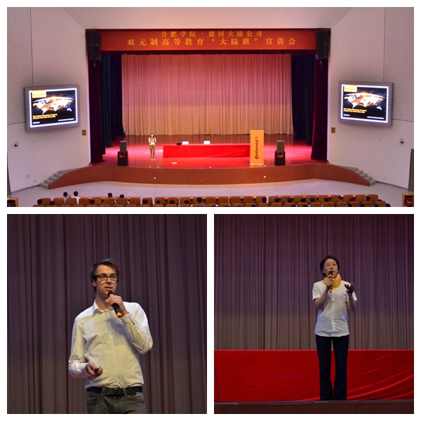 9月19-20日,為做好合肥學院·德國大陸公司雙元制高等教育“大陸班”的宣傳招生工作,我校特邀請德國大陸集團合肥公司于我校致用禮堂舉辦兩場雙元制高等教育“大陸班”宣講會。宣講會由教務處、國際交流合作處主辦,我校副校長劉建中、大陸馬牌輪胎(中國)有限公司人力資源總監孫怡等應邀出席,機械工程系、電子信息與電氣工程系、計算機科學與技術系、化學與材料工程系、生物與環境工程系、建筑工程系全體2016級(非中外合作專業)新生參加。