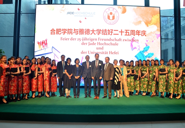 合肥學院與雅德大學結好二十五周年慶典活動在我校圖書館大廳舉行。在觀看了視頻紀念短片后,蔡敬民與德國雅德大學代表科斯特教授分別致辭。雙方回顧了兩校合作歷程后均表示將繼續在現有合作基礎上進一步深化友誼。賴斯部長發表講話,他提到,合肥學院與雅德大學合作基礎雄厚、交往密切,也推動了中德年輕人的交往互動,對雙方來說都是一種智慧投資。慶典活動中,兩校合作培養的338名學生中有部分代表也來到了現場發表感言,并向兩所母校分別贈送了紀念品。合肥學院學生合唱團為到場嘉賓進行了表演,現場氣氛和諧活潑。慶典結束后,賴斯部長及代表團一行在校園里共同種植下象征中德友誼的常青樹。