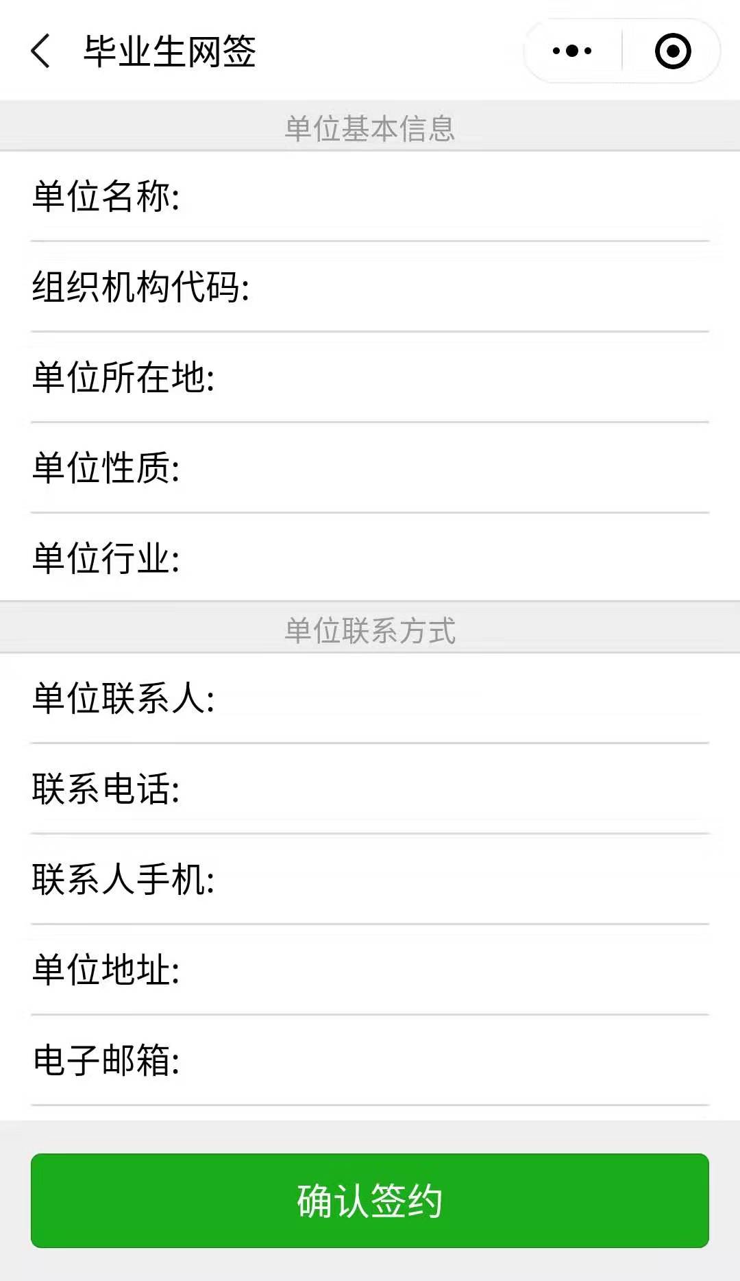 第二步、用人單位打開微信,使用掃一掃功能,掃碼后,會出現填寫簽約信息頁面;用人單位首先驗證畢業生信息,確認下一步后,填寫本單位基本信息和聯系方式,并選擇簽約畢業生的工作崗位,然后點擊“確認簽約”后提交。