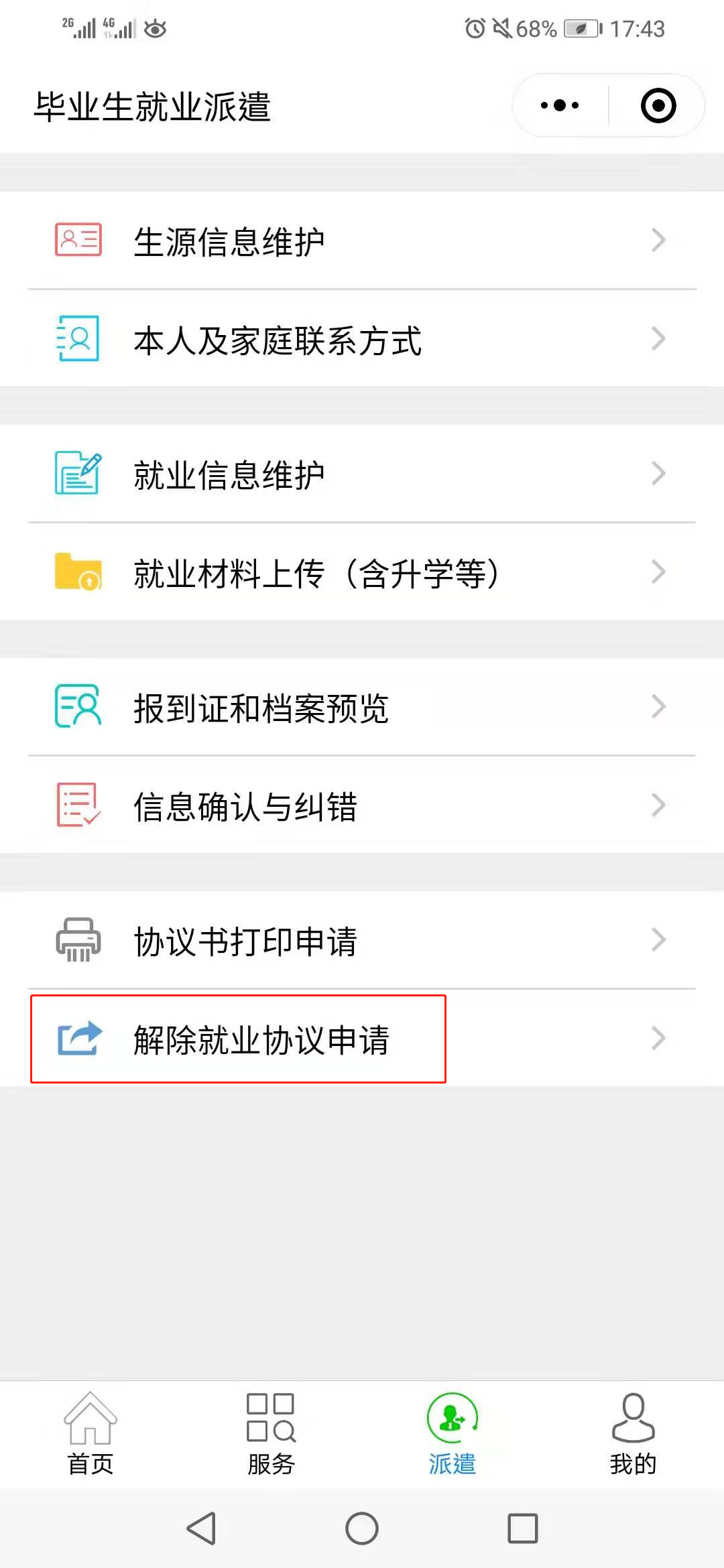 第一步、畢業生進入微信小程序:安徽省大學生就業服務平臺,點擊“派遣”,進入“解除就業協議申請”,上傳解約申請材料。
