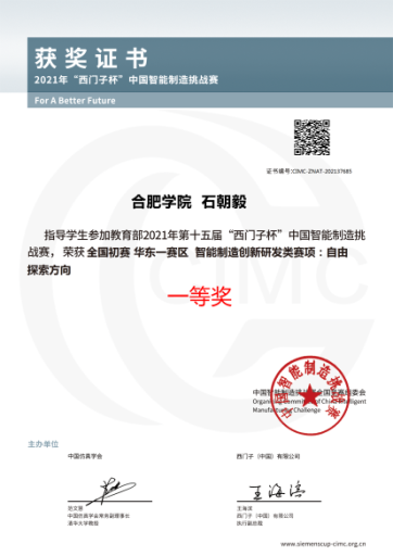2021年7月20日,教育部第十五屆CIMC “西門(mén)子杯”中國(guó)智能制造挑戰(zhàn)賽全國(guó)初賽順利舉通過(guò)線上線下兩種形勢(shì)同期進(jìn)行,于24日圓滿落下帷幕。本屆來(lái)自全國(guó)近700所高校中的6000支參賽隊(duì)伍累計(jì)1萬(wàn)余名師生。經(jīng)過(guò)專家網(wǎng)上評(píng)審及下評(píng)測(cè),最終電子信息工程系4支隊(duì)伍突出重圍。共獲得全國(guó)初賽 華東一賽區(qū)一等獎(jiǎng)2項(xiàng),二等獎(jiǎng)1項(xiàng),三等獎(jiǎng)1項(xiàng)。沈鳳嬌和張勝老師指導(dǎo)的18級(jí)電子信息工程學(xué)生童子文、吳艷、17級(jí)電子信息學(xué)生丁義組成油刃有魚(yú)隊(duì)獲得自由探索方向全國(guó)初賽 華東一賽區(qū)一等獎(jiǎng)電子信息工程專業(yè)18級(jí)學(xué)生劉文佳、19級(jí)楊成曉、17級(jí)房晴晴組成的科技先驅(qū)小隊(duì)隊(duì)獲得自由探索方向全國(guó)初賽 華東一賽區(qū)二等獎(jiǎng);沈鳳嬌和石朝毅老師指導(dǎo)的18級(jí)電子信息學(xué)生徐梓強(qiáng)、18級(jí)自動(dòng)化學(xué)生趙慧杰付紫平組成的Fly隊(duì)獲得自由探索方向全國(guó)初賽 華東一賽區(qū)一等獎(jiǎng)。沈鳳嬌和張勝老師指導(dǎo)的電子信息工程18級(jí)徐秋洋、19級(jí)朱家樂(lè),自動(dòng)化18級(jí)學(xué)生楊深慧組成的“跡行”隊(duì)獲智能產(chǎn)線與協(xié)作機(jī)器人方向全國(guó)初賽華東一賽區(qū)三等獎(jiǎng)。