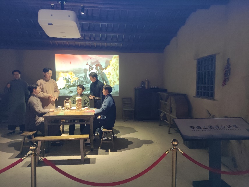 繼續(xù)往前走去,最引人注目的莫過于那組生動再現(xiàn)中共安徽工委成立場景的蠟像。這些蠟像栩栩如生,細節(jié)之處盡顯匠心,不僅人物的神態(tài)、動作被刻畫得惟妙惟肖,就連當時的場景氛圍也被完美地營造出來。蠟像中的每一位人物都仿佛有了生命,他們或激昂陳詞,或沉思默想,或緊握雙拳,共同展現(xiàn)出了中共安徽工委成立時的那份堅定與決心。站在這些蠟像面前,仿佛能夠聽到歷史的回響,感受到那股從過去穿越而來的革命激情。隨后,團隊成員來到了在安徽工委帶領下開展抗戰(zhàn)斗爭事跡的展館部分。這個展館以生動而詳實的方式,再現(xiàn)了那段烽火連天的歲月,展館中設有3D投影展示,身臨其境地展示了到那個時代的氛圍和斗爭的殘酷。通過現(xiàn)代化的展示手段,歷史不再僅僅是書本上的文字,而是變得鮮活起來,觸動著每一個人的心靈。隨后,團隊成員懷著沉痛的心情,共同閱讀了劉云峰烈士的生平介紹,劉云峰烈士的英勇無畏、堅定信念以及為革命事業(yè)獻身的崇高精神,也將成為激勵我們不斷前行的強大動力。