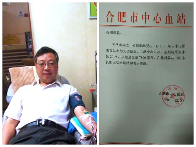 姜從山曾榮獲2014—2015年度“無償獻血貢獻金獎”,該獎是以兩年為限,獻血小板達40個治療量以上,方有資格獲得。目前,姜從山已經(jīng)是合肥市注冊志愿者,每年至少志愿服務(wù)30小時。姜老師還經(jīng)常利用雙休日赴合肥南站、大學(xué)城獻血屋等地進行志愿服務(wù)。合肥市中心血站曾經(jīng)給姜老師寄了一封感謝信,感謝姜老師這些年的無償獻血。