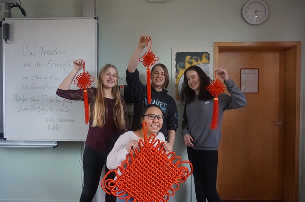 元月二十四日、二十九日和三十一日德國施特拉爾松孔子學(xué)院分別在其開設(shè)中文課程的施特拉爾松德漢薩文理中學(xué),格賴夫斯瓦爾德蒙特蘇里文理中學(xué)以及洪堡文理中學(xué)舉辦了豐富多彩的迎新年、慶春節(jié)文化體驗(yàn)活動(dòng)。為了使學(xué)生們對(duì)中國的春節(jié)有直觀的感性認(rèn)識(shí),孔院老師帶去了新書寫的對(duì)聯(lián)、大紅的“福”字和中國結(jié),并詳細(xì)解釋其各自的文化含義。學(xué)生們對(duì)這些富含文化元素的物品充滿了興趣,紛紛贊嘆其獨(dú)特與神奇。孔院老師們“趁熱打鐵”,教同學(xué)們嘗試寫毛筆字,在古老的漢字藝術(shù)中體味傳統(tǒng)文化的韻味。最后大家一邊品嘗著孔院老師帶來的中國糖果,一邊觀賞傳統(tǒng)動(dòng)畫片《大鬧天宮》,在歡樂的氛圍中結(jié)束了新鮮有趣的、喜迎春節(jié)的文化之旅。