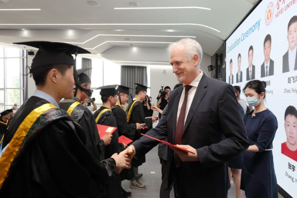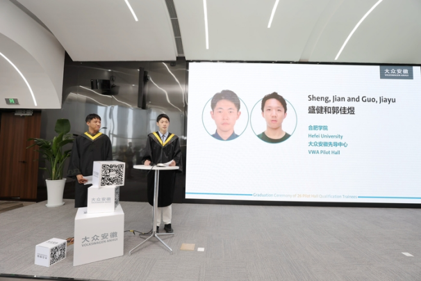 The morning of June 16 sees the graduation ceremony at Volkswagen Anhui of the first batch of “Seed Engineers” jointly trained by HFU and Volkswagen Group China. Wu Chunmei, HFU President, attends the ceremony together with Mr. Jens Pfitzinger, Volkswagen Group Executive Vice-president and Dr. Gabardi, CEO of Volkswagen Anhui.