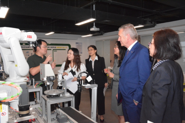 Afterwards, Mr. Wulff visited the school-enterprise training platform of Volkswagen College and highly affirmed HFUs school-running orientation locality, application and internationalization.
