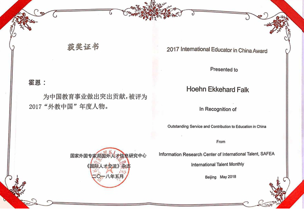 On May 24th, Professor Hoehn Ekkehard Falk, vice president of Hefei University and the winner of "2014 Friendship Award" (China’s highest honor granted to foreigners), is granted the “2017 International Educator in China Award” by the State Administration of Foreign Expert Affairs (SAFEA).