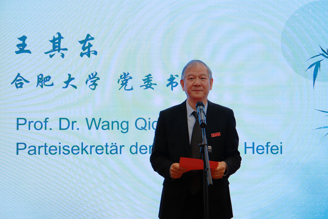 隨后,雙方來到設計學院參加德國學生徽文化秋令營結業儀式。儀式在活動回顧短片中開場,短片展示了德國學生在合肥大學交流期間豐富多彩的學習生活,德國學生深度體驗舞龍舞獅、中國功夫、針灸推拿、書法、飲茶等多種不同的中華傳統文化,深刻體現了中華文化的魅力。王其東書記代表學校對卡塔琳娜·普特市長一行表示熱烈的歡迎,對徽文化秋令營的成功舉辦表示祝賀,他表示德國同學在短短一周內同中國學生建立起深厚情誼,為日后攜手書寫兩校友誼新篇章打下堅實基礎,此次交流為雙方未來教育、經濟、文化發展注入了生機與活力。奧斯納布呂克應用科學科學大學校長亞歷山大·施梅曼先生在致辭中感嘆中國發展速度之快,同時也很高興看到合肥大學的高速發展變化,希望有更多形式的交流活動能夠加深兩校友誼,深化合作與發展。德國奧斯納布呂克應用科學科學大學的學生代表伊爾薩比·拉德馬赫發言,她向大家分享了她在合肥大學交流期間新奇的體驗與感悟,并表示會記住這段美好回憶。