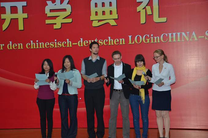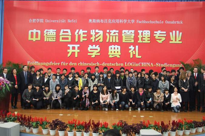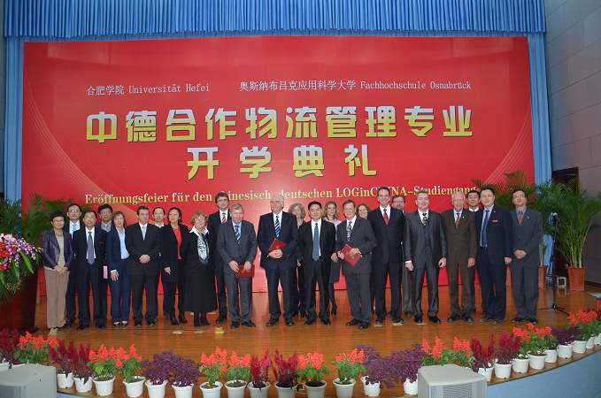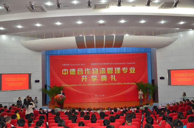 10月30日上午,教育部批準(zhǔn)的安徽省第一個對外合作辦學(xué)項目——我院中德合作物流管理專業(yè)開學(xué)典禮隆重舉行。出席典禮的有遠(yuǎn)道而來的德國萊布尼茨研究會主席維恩施德特、德意志學(xué)術(shù)交流中心專員格里查、漢諾威德國中心董事長戈德克、奧斯納布呂克應(yīng)用科學(xué)大學(xué)前校長米勒豪森以及以校長貝爾特拉姆為團(tuán)長的奧斯納布呂克應(yīng)用科學(xué)大學(xué)代表團(tuán),安徽省教育廳副廳長李和平、外事處處長耿尊芳,我院領(lǐng)導(dǎo)蔡敬民、陳嘯、丁明、洪家友等。我院副院長陳嘯和德國奧斯納布呂克應(yīng)用科學(xué)大學(xué)副校長雷恩共同主持了典禮。