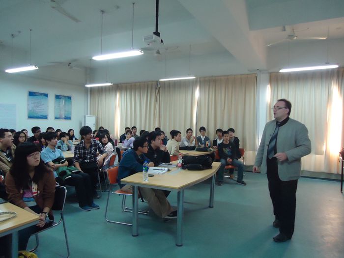 10月24日和29日,格里查先生分別為2011級和2012級中德物流專業的同學進行了兩場關于德語文章閱讀技巧的教學活動。格里查先生首先把在場60多位學生分成了12個小組,并發放閱讀文章及卡紙,要求以小組為單位提出五點閱讀技巧。十分鐘后,每組將總結出來的閱讀技巧粘貼到墻上并對卡紙上的內容進行了解釋和闡述;在聽取了同學們匯報所采用的閱讀方法后,格里查先生介紹了自己對于文章閱讀方法的研究和見解,并給大家提出了關于提高閱讀能力的技巧的建議。通過這此特殊的德語課,同學們感到受益頗多,紛紛表示會不斷改進自己的閱讀方法,提高閱讀能力,學會在最短的時間內掌握文章的基本信息并準確地回答問題,并在以后的專業學習中加以運用。