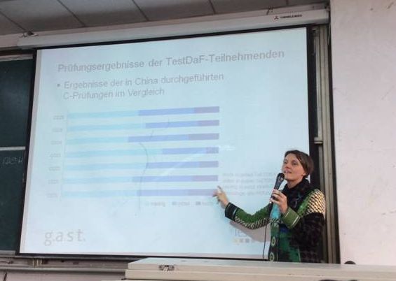 曾留學德國的張婧老師目前為我院學生開設德福備考培訓課,并取得了很好的成果,她自己曾通過德福考試,有切身體會。她先對Karin Böhm女士的報告進行的翻譯,讓學生能更好地理解講座內容,又從德福考試的題型、要求及備考方法等幾個方面進行了詳細地介紹,并結合樣卷對試題難點做了剖析。她還介紹了中國區域德福考點的設置情況以及報考程序和方法,并對德福考試出題的發展趨勢以及我院開設德福備考培訓課的備考策略進行了介紹。她根據自己的學習經歷向學生們傳授了如何提高學習效率的經驗和技巧,并強調,在德語學習過程中,聽、說、讀、寫均衡發展非常重要。德福考試是考核外國人的德語應用能力,只有達到規定的水平,才能在德國高校進行專業學習。