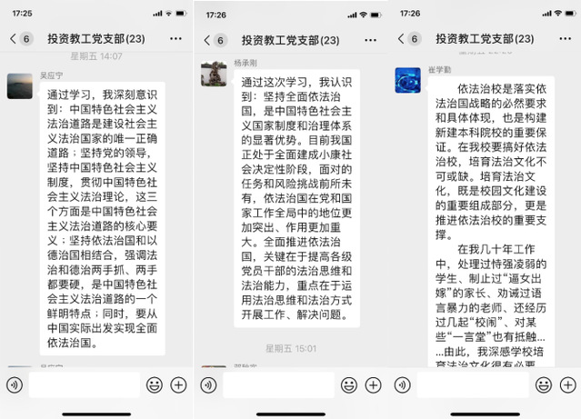 通過(guò)線上線下多種形式的學(xué)習(xí),師生黨員全面了解了習(xí)近平法治思想的科學(xué)體系,并深刻領(lǐng)悟了習(xí)近平法治思想的精髓要義。黨員們紛紛表示,在向第二個(gè)百年奮斗目標(biāo)進(jìn)軍的新征程上,要把深入學(xué)習(xí)《綱要》與深入學(xué)習(xí)貫徹黨的十九屆六中全會(huì)精神緊密結(jié)合起來(lái),全面系統(tǒng)學(xué)習(xí)、完整準(zhǔn)確理解習(xí)近平法治思想,始終堅(jiān)持以習(xí)近平法治思想為指引,自覺(jué)運(yùn)用習(xí)近平法治思想指導(dǎo)解決實(shí)際問(wèn)題,尊崇法治、敬畏法律,注重運(yùn)用法治思維,積極營(yíng)造學(xué)院良好法治環(huán)境,堅(jiān)定不移走中國(guó)特色社會(huì)主義法治道路。