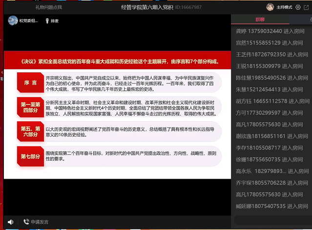 2022年4月12日,經濟與管理學院第六期入黨積極分子線上培訓班第二課《學習貫徹黨的十九屆六中全會精神》順利開講。此次黨課由校黨委委員、黨委組織部部長白義香老師擔任主講。