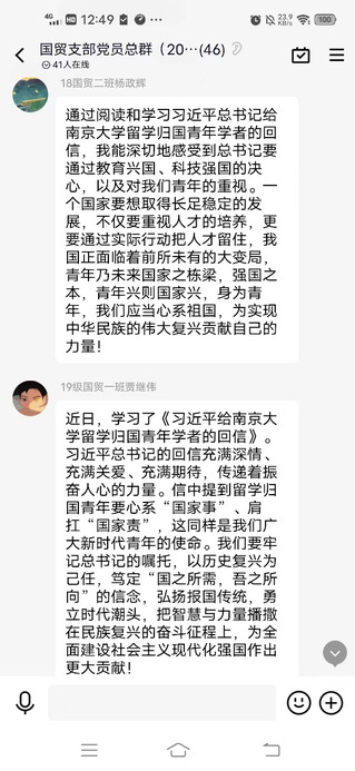 經濟與管理學院黨委要求師生黨員深入學習領會《習近平給南京大學留學歸國青年學者的回信》中的重要論述內涵。習近平總書記指出,青年學者應該大力弘揚留學報國的光榮傳統,以報效國家、服務人民為自覺追求,在堅持立德樹人、推動科技自立自強上再創佳績,在堅定文化自信、講好中國故事上爭做表率。各教職工黨支部、學生黨支部和研究生黨支部均深入學習了《習近平給南京大學留學歸國青年學者的回信》內容和精神,結合工作實際,紛紛就學習內容做線上交流發言,表示青年生逢偉大時代,當時刻謹記習近平總書記殷殷囑托、切切寄語,起而行之、勇挑重擔,在現代化建設新征程上唱響“青春贊歌”。