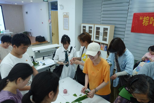 之后,學生黨員們前往服務中心參觀了協商議事廳、圖書閱覽室、老年活動室、黨建動態展區等地。恰逢社區舉辦“粽葉飄香迎端午,溫情義診進社區”活動,學生黨員們熱情地參與其中,并在活動結束后幫助工作人員打掃場地,得到了社區居民們的一致好評。