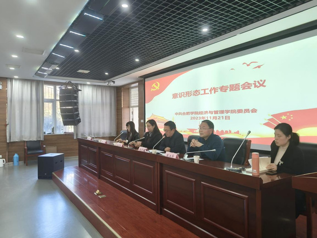 2023年11月21日下午,經濟與管理學院于一期6棟報告廳召開了意識形態工作專題會議。本次會議由經濟與管理學院黨委書記倪澤強主持,經濟與管理學院院長陳江華,黨委副書記、副院長吳悅,黨委副書記夏丹青,副院長于娜,全體教職工出席會議。