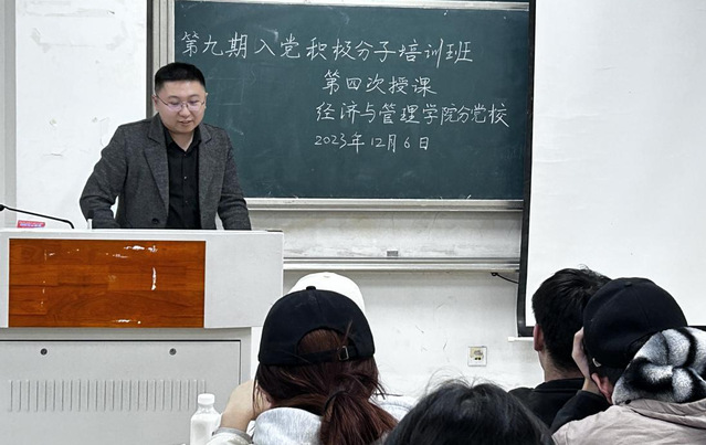 2023年12月6日中午,經濟與管理學院分黨校第九期入黨積極分子培訓班第六課于一期4棟107教室如期舉行。本次培訓班由經濟與管理學院組織員、金融學學生黨支部書記陳維浩主講,我院全體第九期入黨積極分子參加了此次課程。