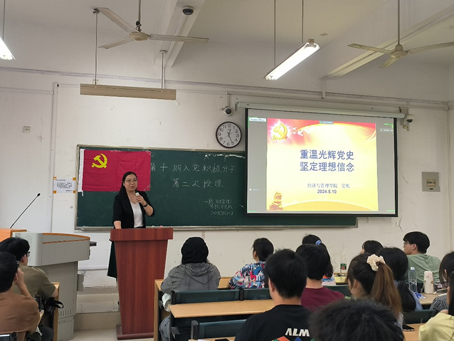 2024年5月10日中午,經濟與管理學院分黨校第十期入黨積極分子培訓班第三課在4棟103、107教室同時進行。經濟與管理學院黨委副書記、副院長吳悅擔任主講人。經濟與管理學院第十期入黨積極分子培訓班全體學員參加學習。