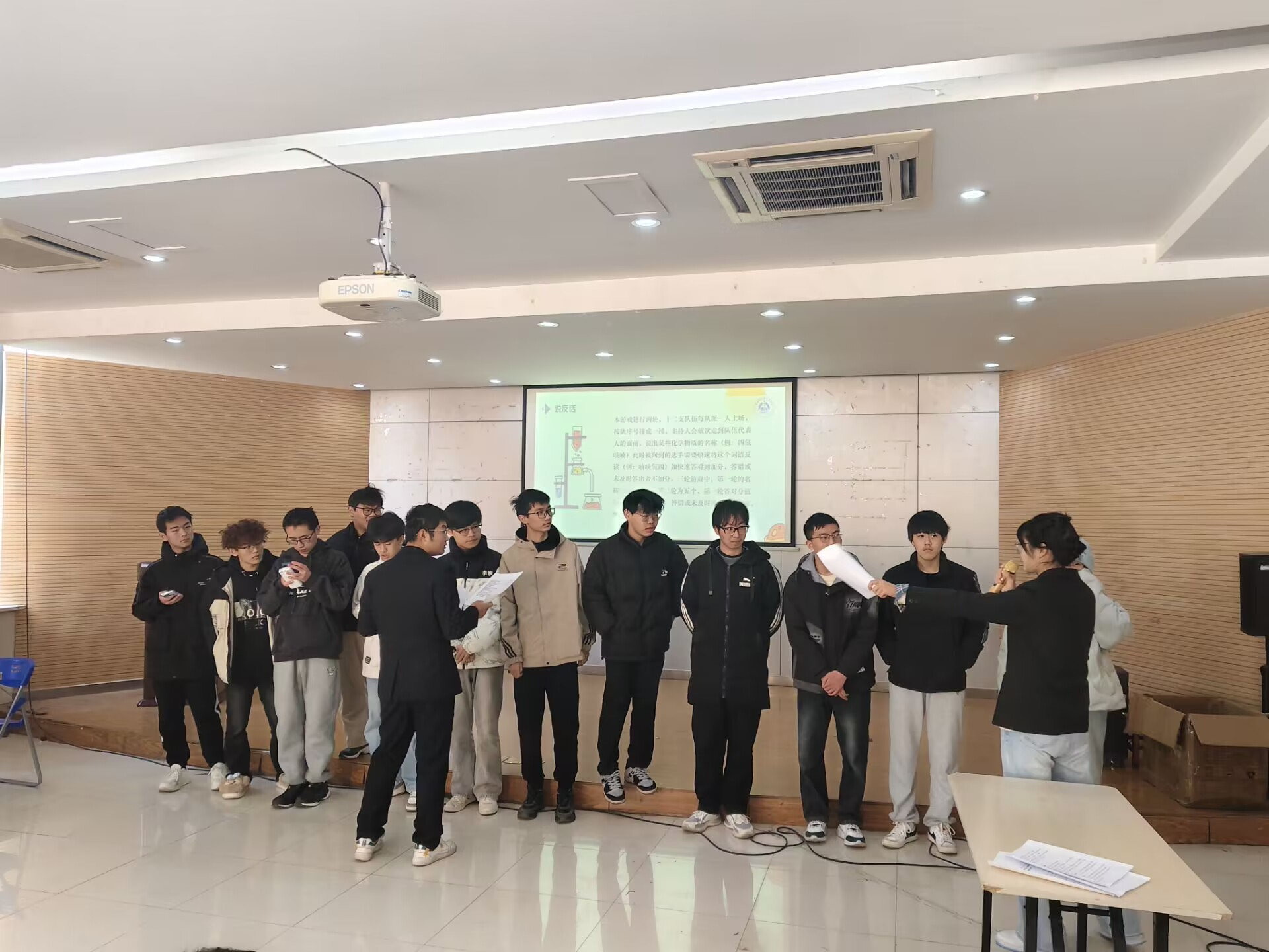 隨后的“化學(xué)謎語”環(huán)節(jié)更是將活動氛圍推向高潮。全隊(duì)成員一同參加,認(rèn)真仔細(xì)觀看相關(guān)化學(xué)內(nèi)容,同樣采用搶答的形式,根據(jù)題目要求進(jìn)行化學(xué)謎語解答共六輪,答對加5分,答錯扣1分,總分?jǐn)?shù)可為負(fù)值。近十幾條精心設(shè)計的化學(xué)謎語涵蓋了化學(xué)元素、化學(xué)反應(yīng)、化學(xué)物質(zhì)特性等多方面知識,從廣為人知的“水上作業(yè)(打一化學(xué)元素)——汞”,到較為復(fù)雜的“干錘百擊出深山,烈火焚燒只等閑。粉身碎骨何所懼,要留清白在人間。(打一種化學(xué)物質(zhì))——石灰”,參與者們或獨(dú)自沉思,或三兩討論,在思索謎底的過程中,深入挖掘化學(xué)知識的奧秘。