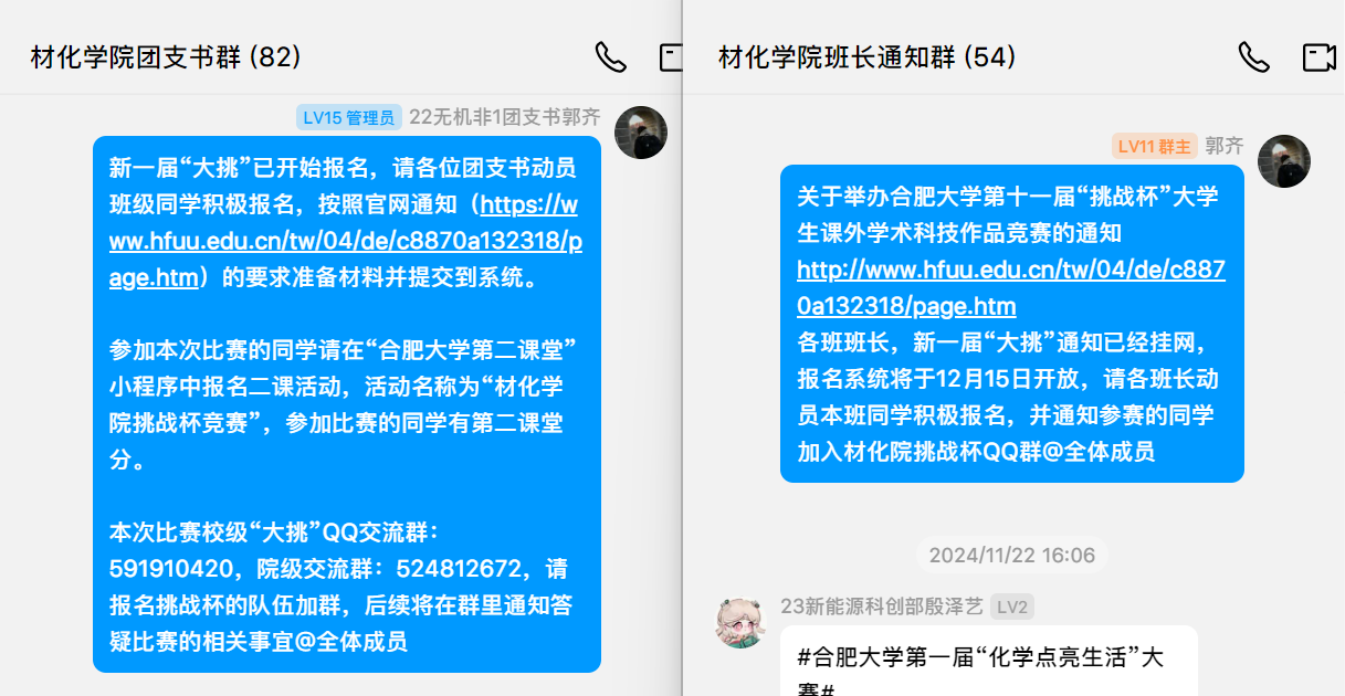 在合肥大學團委發布比賽通知后,材化學院通過多種方式,動員師生積極參加本次競賽,激起了同學們的參賽熱情。科創部及時在學院班長群、學院團支書群下發比賽通知,并由班長、團支書向各個班級轉發通知,確保了比賽信息在各班級全覆蓋。