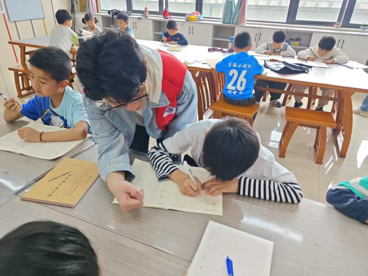 上午,志愿者們齊聚朝霞社區教室,認真地為孩子們進行簽到,確保每位小朋友都能準時參與到活動中來。在隨后的書法課堂上,他們積極協助老師維護課堂秩序,與正在學習書法的孩子們親切交流,讓整個書法課堂變得更加生動有趣,充滿了歡聲笑語。