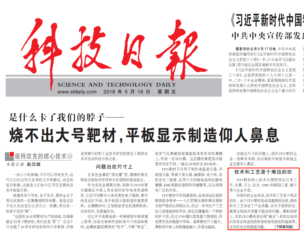 公司的研發基礎和硬件設施包括了材料的粉體合成,成型、燒結和加工等工藝流程,完全覆蓋了無機材料生產的所有環節。拓吉泰公司未來將圍繞著全國特別是本省地區重點發展領域,就顯示行業和光伏用陶瓷靶材以及半導體設備中的陶瓷部件被國外廠家壟斷的現狀,有針對性的開發產業鏈中所需的無機陶瓷材料,填補國內在上述領域中的空白,替代進口產品。