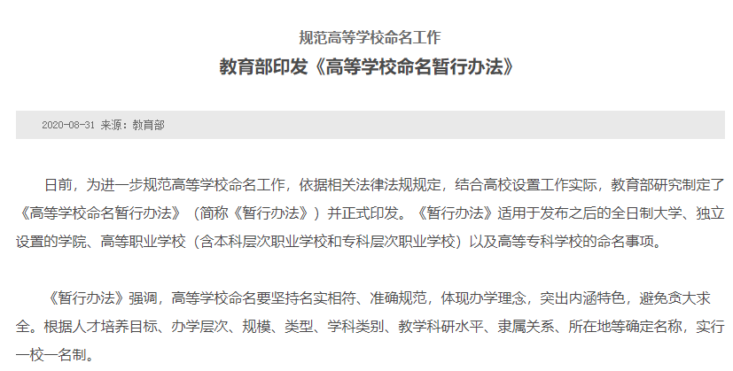 日前,為進一步規范高等學校命名工作,依據相關法律法規規定,結合高校設置工作實際,教育部研究制定了《高等學校命名暫行辦法》(簡稱《暫行辦法》)并正式印發。《暫行辦法》適用于發布之后的全日制大學、獨立設置的學院、高等職業學校(含本科層次職業學校和??茖哟温殬I學校)以及高等??茖W校的命名事項。