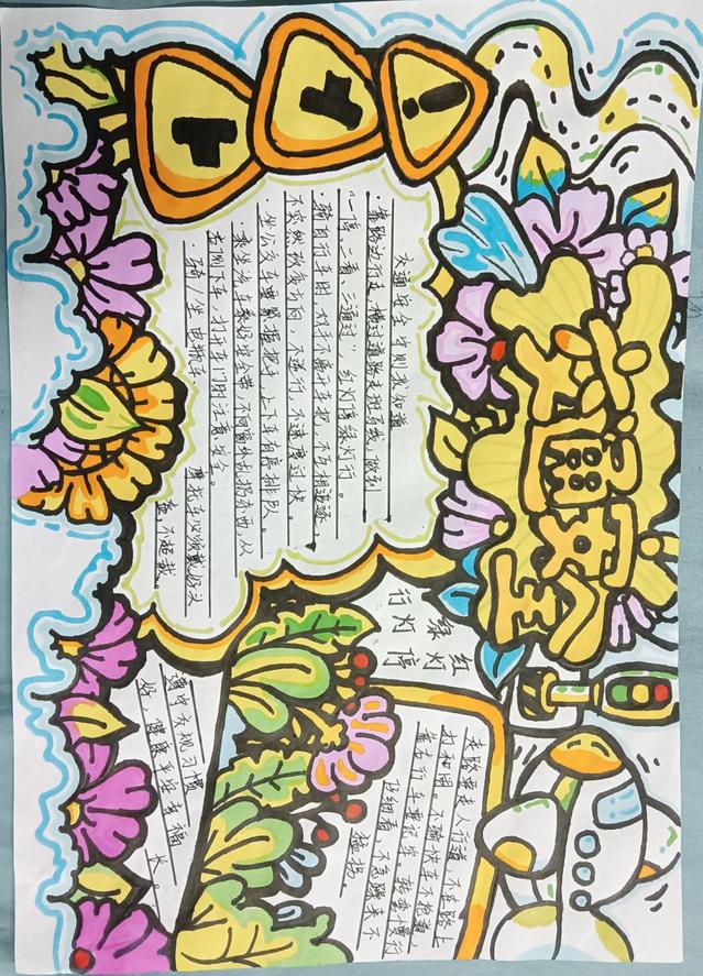 此次活動吸引了學生的積極參與,他們利用課余時間搜集資料,精心設計手抄報內容。同學們的作品不僅版面設計精美,而且主題多樣,涵蓋了交通信號識別、安全行走規則、騎行和乘車安全等多個方面,充分展示了學生們對交通安全重要性的認識和理解。活動參與者用手中的筆繪出生動的圖畫、寫下有力的文字,呼吁大家學習交通法規,并將其應用到日常生活中,共同營造一個安全、和諧的校園環境。