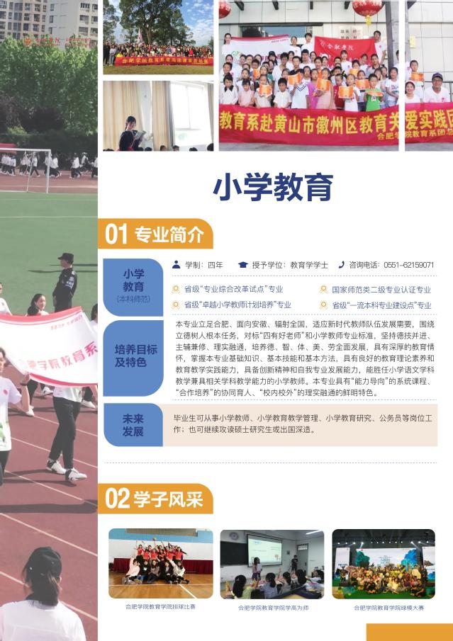 小學(xué)教育(本科 師范) 咨詢電話:0551-62159071 通過國家?guī)煼额惗墝I(yè)認(rèn)證專業(yè) 省級“一流本科專業(yè)建設(shè)點(diǎn)”專業(yè) 省級“專業(yè)綜合改革試點(diǎn)”專業(yè) 省級“卓越小學(xué)教師計(jì)劃培養(yǎng)”專業(yè) 學(xué)制:四年 授予學(xué)位:教育學(xué)學(xué)士 培養(yǎng)目標(biāo)及特色:本專業(yè)立足合肥、面向安徽、輻射全國,適應(yīng)新時(shí)代教師隊(duì)伍發(fā)展需要,圍繞立德樹人根本任務(wù),對標(biāo)“四有好老師”和小學(xué)教師專業(yè)標(biāo)準(zhǔn),堅(jiān)持德技并進(jìn)、主輔兼修、理實(shí)融通,培養(yǎng)德、智、體、美、勞全面發(fā)展,具有深厚的教育情懷,掌握本專業(yè)基礎(chǔ)知識、基本技能和基本方法,具有良好的教育理論素養(yǎng)和教育教學(xué)實(shí)踐能力,具備創(chuàng)新精神和自我專業(yè)發(fā)展能力,能勝任小學(xué)語文學(xué)科教學(xué)兼具相關(guān)學(xué)科教學(xué)能力的小學(xué)教師。本專業(yè)具有“能力導(dǎo)向”的系統(tǒng)課程、“合作培養(yǎng)”的協(xié)同育人、“校內(nèi)校外”的理實(shí)融通的鮮明特色。 畢業(yè)生發(fā)展方向:畢業(yè)生可從事小學(xué)教師、小學(xué)教育教學(xué)管理、小學(xué)教育研究、公務(wù)員等崗位工作;也可以繼續(xù)攻讀碩士研究生或出國深造。
