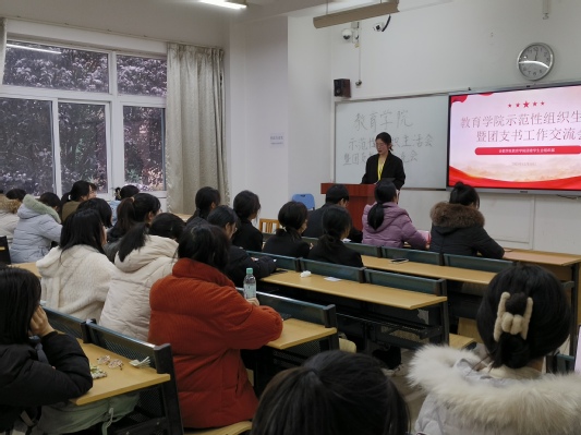 傳革命薪火,展青春舞姿。為了發揚共青團精神,展現青年之志,12月19日下午4時,教育學院示范性組織生活會暨團支書工作交流會在三棟102教室順利舉行。教育學院團委副書記張弦樂、團委學生會兼職副書記屠厚輝、團委學生會兼職副書記李艾錦、各班級團支書以及21級應用心理學班全體同學參會,組織部部長朱思宇擔任主持人。