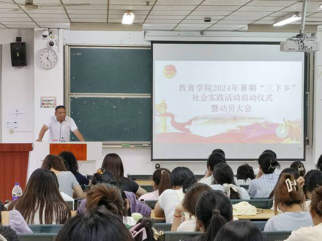 風好正揚帆,實踐須力行。為了響應國家鄉村振興戰略,號召和動員學院廣大師生積極參與社會實踐,用自身力量服務社會實踐,貢獻青春力量。6月19日中午12:10在三棟101教室舉行教育學院2024年暑期“三下鄉”社會實踐活動啟動儀式暨動員大會,標志著這一充滿青春活力和服務熱情的社會實踐活動正式拉開帷幕。出席這次大會的有教育學院黨委副書記王迅、團委副書記張弦樂,團委學生兼職副書記屠厚輝、李艾錦以及三下鄉重點團隊和實踐小組的成員。會議由組織部部長朱思宇主持。