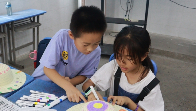 7月6日,合肥大學(xué)教育學(xué)院“同筑鄉(xiāng)村夢,共‘育’振興果”志愿服務(wù)隊(duì)在合肥市小廟鎮(zhèn)蜀山行知學(xué)校開展暑期“三下鄉(xiāng)”社會實(shí)踐活動。美育是審美教學(xué)與美感教學(xué)的結(jié)合,是新時代培養(yǎng)德智體美勞全面發(fā)展的社會主義建設(shè)者和接班人的重要著力點(diǎn),其中藝術(shù)是美育最集中最典型的形態(tài)。本次課程,教師魯?shù)つ菀悦烙鳛榍腥朦c(diǎn)給小朋友們帶來了一節(jié)妙趣橫生的草帽繪制藝術(shù)。