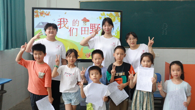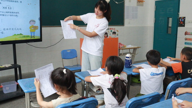 7月8日上午,合肥大學教育學院“同筑鄉村夢,共‘育'振興果”志愿服務隊于合肥市小廟鎮蜀山行知學校開展暑期“三下鄉”社會實踐活動。團隊成員黃秋語為學生帶來了少兒合唱歌曲《我們的田野》,旨在通過歌曲傳唱讓學生感受祖國山川之秀麗,以美育人、以文化人,增強學生感受美、鑒賞美、創造美的能力,進一步提升學生的全面素養。 “田野是一片百花齊放的花田,有許多穿著花裙子的小姑娘在跳舞…”課堂上,學生們介紹自己眼中的田野。教師利用多媒體課件展示曲譜和歌詞,指導學生朗讀歌詞,體會歌曲的節奏、韻律及思想內涵,引出話題“你在歌詞中看到了什么意象”,啟發學生的思考。學生在教師的指導與幫助下找出田野、湖水、鯉魚、野鴨、工人等意象,歌詞中充滿了童真童趣。五段歌詞中既有概括描寫,也有細致刻畫,各個意象之間緊密聯系、形成整體。隨后,教師為學生介紹歌詞創作背景,播放歌曲音頻及舞蹈視頻,讓學生感受歌曲的音樂情緒及旋律特點。