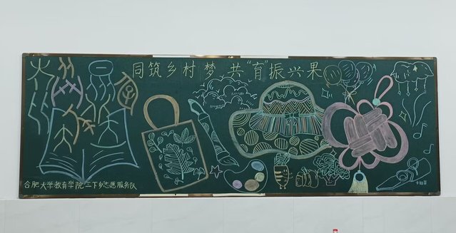為貫徹習近平總書記對美育工作的重要論述,堅持以美育人,以文化人,提高同學們審美和人文素養(yǎng)。7月7日至7月9日,合肥大學教育學院“同筑鄉(xiāng)村夢,共‘育’振興果”志愿服務隊在合肥市小廟鎮(zhèn)蜀山行知學校開展以“色彩斑斕繪校園,青春活力展希望”為主題的繪畫活動。 結(jié)合實地情況,明確繪畫主題。活動前,團隊成員準備豐富的繪畫材料和工具,并對學校的環(huán)境進行細致的調(diào)研,確定繪畫主題,設(shè)計繪畫圖案。 揮灑創(chuàng)作熱情,凝聚青春力量。團隊成員在確定墻面繪畫主題后,選擇綠色和藍色兩種顏色作為墻面繪畫的主色調(diào)。在繪制的過程中,室外團隊成員不畏夏日的炎熱,化身為“校園美化師”。他們一手捧著顏料,一手握著毛刷,構(gòu)圖、描圖、修整、上色······成員間分工明確,密切配合,在墻面上肆意揮灑創(chuàng)作。藍色的書本、棕色的鉛筆、黃色的燈泡,每一筆、每一劃都傾注著他們的熱情與心血。夕陽漸漸西下,落日的余輝染紅了半邊天空,白墻褪去從前的沉悶與單調(diào),充滿藝術(shù)氣息,成為校園里一道靚麗的風景線。與此同時,室內(nèi)團隊成員精心設(shè)計,認真繪制黑板報。
