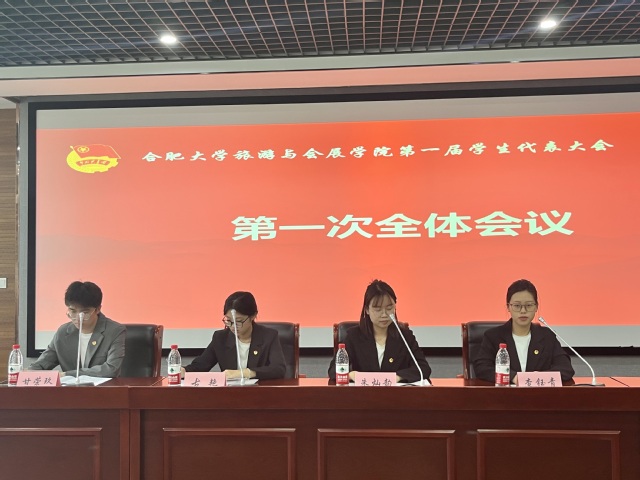 合肥大學旅游與會展學院第一次學生代表大會第一次全體會議于6月14日上午在博學樓C座學術報告廳順利召開。出席本次的有旅游與會展學院團委學生兼職副書記朱燦韻、第二十屆學生會主席團成員古艷、查鈺青、甘榮玖以及全體學生代表。會議由李湘主持。