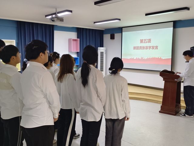 新團員代表張宗宇發言,他表示將嚴格要求自己,努力學習,提升自我,以實際行動踐行入團初心。優秀老團員代表肖一瑤也在儀式上發言,他分享了在團內的成長經歷和收獲,鼓勵新團員積極參與團組織活動,培養社會責任感和團隊協作精神,他期待與新團員們共同成長進步。緊接著,楊林向新團員們表示祝賀,并提出殷切期望,希望新團員們能夠認識到身份上的轉變,堅定自身理想信念,積極學習黨的科學理論知識,胸懷理想、增長才干,在新時代展現新作為。