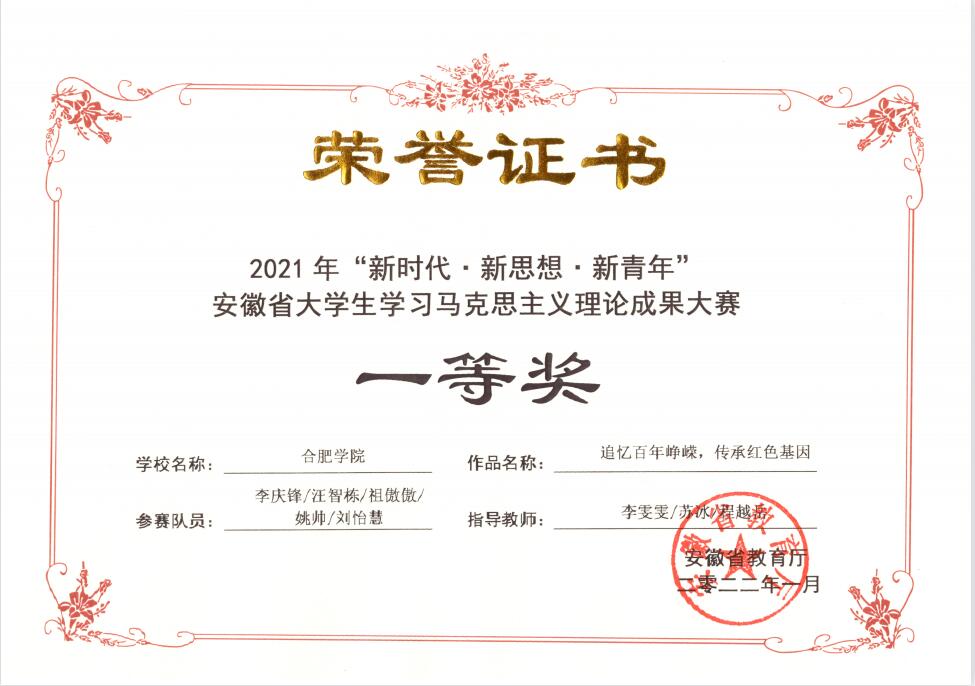 近日,2021年“新時代?新思想?新青年”安徽省大學生學習馬克思主義理論成果大賽評審結果在安徽省教育廳網站公布。我校選送的5件作品有2件獲獎,其中一等獎1項、三等獎1項,這是我校在此賽事中首次實現榮獲一等獎的突破。三位教師獲優秀指導教師獎。