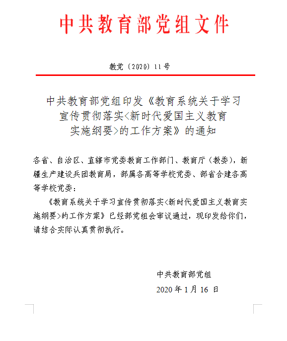 中共教育部黨組印發《教育系統關于學習宣傳貫徹落實<新時代愛國主義教育實施綱要>的工作方案》的通知(教黨〔2020〕11號)