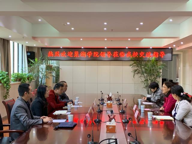 11月14日下午,巢湖學(xué)院朱定秀副校長(zhǎng)率科技處處長(zhǎng)萬新軍,副處長(zhǎng)朱明等一行來我校調(diào)研交流。合肥學(xué)院黨委委員、黨委副書記劉建中,副校長(zhǎng)陳秀,研究生處副處長(zhǎng)葛春梅等熱情接待了巢湖學(xué)院一行。會(huì)議由葛春梅主持。