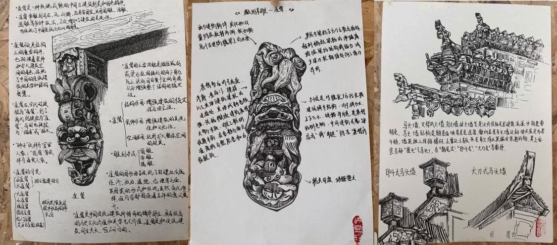 學生們的研學地點主要是碧山和西遞,同時在秀里影視村和屯溪老街進行了民俗考察。日間課程包括風景寫生和民俗調研,晚間則有教師評畫和學生民俗知識分享活動,以增強學生的實際技能和文化知識。其中,視覺傳達設計專業的學生通過《民俗考察》課程,深入了解皖南地區的文化和民俗,激發了對民俗藝術的興趣,并提升了跨文化設計能力。晚間,學生們通過分享和繪畫結合的方式,深入了解并展現皖南的民俗場景和建筑文化,加強了對該地區文化的理解和體會。